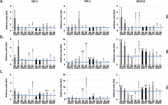 Figure 2: Cisplatin enhances drug transporter expression. EGI-1, TFK-1 and BCLC12 cell lines were treated with their corresponding IC20 (20) or IC50 (50) cisplatin dose for 24h (A), 48h (B) and 72h (C). mRNA expression levels of hCNTs, hOCT1 and hENTs were determined by RT-PCR. Results are mean ± S.E.M. (n=3-4). Statistical significance was determined with Student’s t-test; p<0.05*, p<0.01**, p<0.005***.