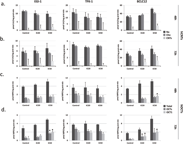 Previous works showed alterations in the mRNA levels of some members of the SLC gene superfamily in liver cancer cell lines after 72h of cisplatin treatment at IC50 dose [18]. These prompted us to analyze the expression of several drug transporters after cisplatin treatment in cholangiocarcinoma. Cell lines were treated with their corresponding IC20 or IC50 dose of cisplatin (Supplementary Figure 2) and hCNTs, hOCT1, hENT1 and hENT2 expression was determined 24, 48 and 72h later (Figure 2). Increases in the drug transporters hCNT1, hCNT3, hOCT1 and hENT1 were observed in the three cell lines especially from 48h treatment, although with variable extent depending on cell line. Analysis of nucleoside transport under the same conditions, showed a trend to increase in the hCNT-related sodium-dependent nucleoside uptake in EGI-1 and BCLC12 cell lines at 48h and 72h after treatment (Figure 3). Moreover, both cell lines displayed a significant increase in hOCTs-dependent uptake and in particular showed a significant increment in hOCT1 uptake at 72h after the IC50 cisplatin treatment (Figure 3). However, despite the significant increase observed in hCNT3 and hOCT1 at 48h, no activity changes were observed in the TFK-1 cell line for any of the analyzed transporters.