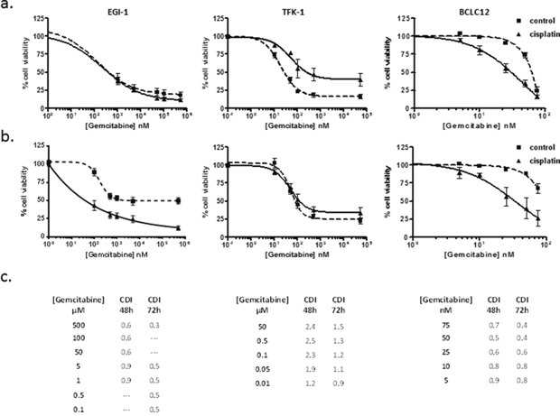 Figure 4: Gemcitabine cytotoxic effect improves with the administration temporal pattern. Dose-response curves in EGI-1, TFK-1 and BCLC12 cell lines combining cisplatin and gemcitabine. Cells were treated with IC20 cisplatin dose (solid line) or vehicle (dashed line) and 48h (A) and 72h (B) later were treated with gemcitabine increasing doses. (C) CDI values for CDDP and gemcitabine combination treatments at 48h and 72h. Results are expressed as mean ± S.E.M. (n=3).