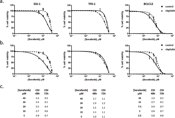 Figure 5: Sorafenib cytotoxic effect improves with the administration temporal pattern. Dose-response curves in EGI-1, TFK-1 and BCLC12 cell lines combining cisplatin and sorafenib. Cells were treated with IC20 cisplatin dose (solid line) or vehicle (dashed line) and 48h (A) and 72h (B) later were treated with sorafenib increasing doses. (C) CDI values for CDDP and sorafenib combination treatments at 48h and 72h. Results are expressed as mean ± S.E.M. (n=3).