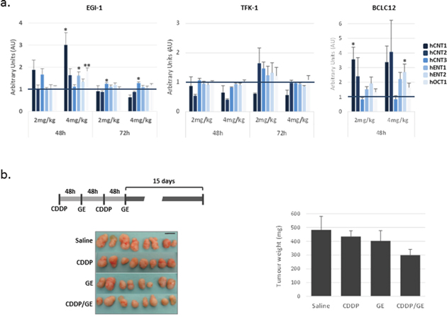 Figure 6: Delayed combination treatment potentiates gemcitabine effect in EGI-1 derived tumors. (A) Effect of cisplatin treatment on drug transporters in vivo. Drug transporter expression after 48h and 72h of cisplatin treatment at 2 mg/kg and 4 mg/kg in EGI-1, TFK-1 and BCLC12 derived subcutaneous tumors. (B) Combination treatment of cisplatin and gemcitabine in EGI-1 derived tumors following the indicated treatment schedule. Tumor weight and tumor pictures at the end of the experiment. Bars are means ± S.E.M. (n=8). Statistical significance was determined with ANOVA.