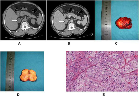 Figure 1: Primary hyperaldosteronism in a 59-year-old male patient. (A and B) CT image (plain and contrast) of primary adrenal aldosterone-producing adenoma. (C and D) Specimen picture of aldosterone-producing adenoma. (E) H & E staining of the aldosterone-producing adenoma (10 × 10).