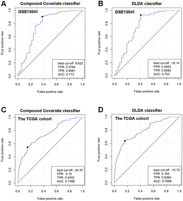Figure 2: Comprehensive ability of the 20-gene signature to separate radiation group and no radiation group in GSE13041 and the TCGA cohort. The ROC curves were used in 2 different linear classifiers (DLDA classifier and Compound Covariate classifier). (A) ROC curve for Compound Covariate classifier in GSE13041. (B) ROC curve for DLDA classifier in GSE13041. (C) ROC curve for Compound Covariate classifier in the TCGA cohort. (D) ROC curve for DLDA classifier in the TCGA cohort.