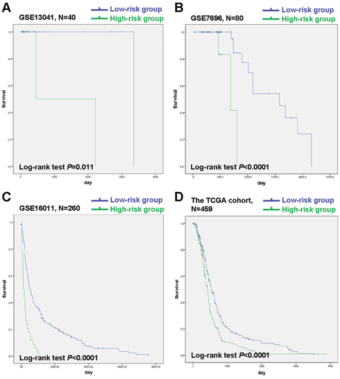 Figure 5: Kaplan-Meier analysis of OS of patients in the low-risk group and the high-risk group in GSE13041, GSE7696, GSE16011 and the TCGA cohort. (A) Kaplan-Meier curves in GSE13041 (high risk=8, low risk=32). (B) Kaplan-Meier curves in GSE7696 (high risk=14, low risk=66). (C) Kaplan-Meier curves in GSE16011 (high risk=34, low risk=226). (D) Kaplan-Meier curves in the TCGA cohort (high risk=230, low risk=229). The tick marks on the Kaplan-Meier curves represent the censored subjects.