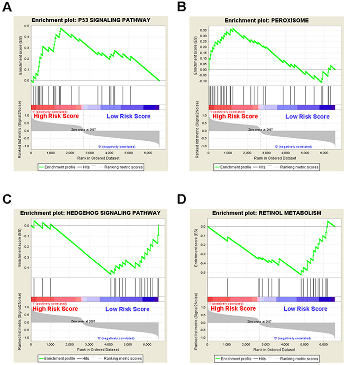 Figure 6: Gene set enrichment analysis reveals the 5-gene signature associated biological pathways and processes in the GSE13041 cohort. GSEA validated (A) p53 signaling pathway and (B) peroxisome were enriched in the high-risk group, and (C) hedgehog signaling pathway and (D) retinol metabolism were enriched in the low-risk group.