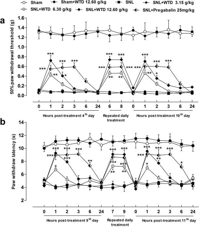 72 hours after SNL operation, when mechanical allodynia or heat hyperalgesia is fully developed, behavioral analysis were carried out on alternate days from day 4 to day 11, on day 4 and day 5, mechanical allodynia and heat sensitivity were tested 0, 1, 2, 3, 6, 24 hours following WTD (3.15-12.60 g/kg, p.o.), pregabalin (25 mg/kg, p.o.) [48] or vehicle (distilled water, 10 ml/kg, p.o.) treatments, respectively. Time points with optimal drug effects were selected for subsequent behavioral tests, time course profiles of behavioral tests were similar to that of the first day after drugs or vehicle treatments on the ending day.