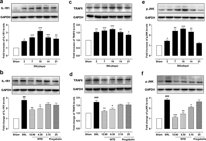 Figure 3: WTD decreased IL-1R1, TRAF6 expressions and p-JNK level in the dorsal horn of L5 spinal cord tissue. Time course profile of IL-1R1, TRAF6 expressions, and p-JNK levels in the dorsal horn of the L5 spinal cord in sham- or SNL-operated mice (a, c, e). Chronic administration of WTD (3.15-12.60 g/kg) dose-dependently reduced IL-1R1, TRAF6 expressions and p-JNK levels in spinal cord tissue, while pregabalin (25 mg/kg, p.o.) had no obvious effects on those factors (b, d, f). Data are represented as mean ± SEM. (n=3). ##P<0.01, ###P<0.001 vs. sham group; *P<0.05, **P<0.01 and ***P<0.001 in Figure 3a-3c vs. sham group, in Figure 3b-3f vs. SNL group.
