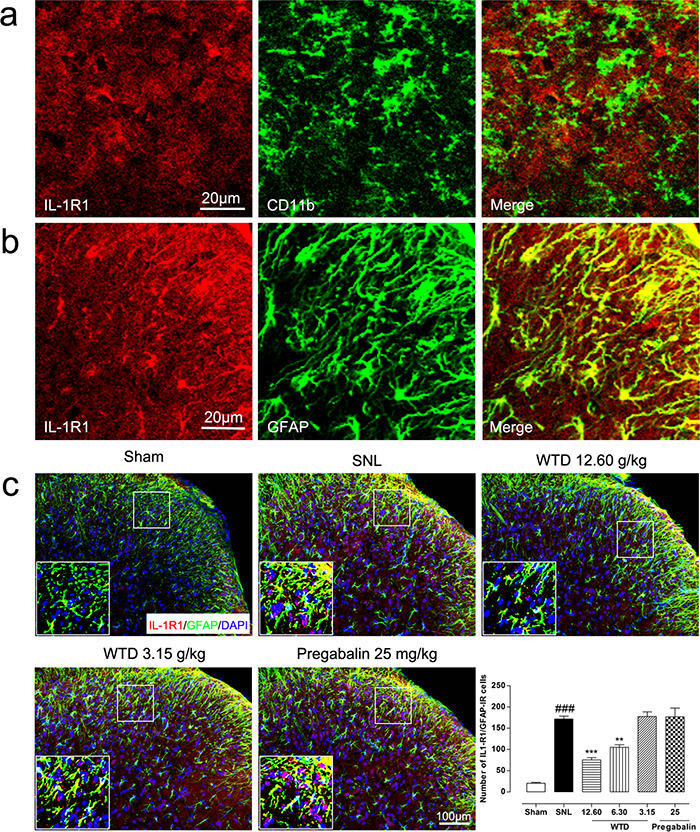Figure 4: WTD decreased spinal astrocytic expression of IL-1R1. 10 days after surgical operation, IL-1R1 has no co-localization with microglia marker of CD11b (a), and were primarily co-localized with astrocyte marker of GFAP (b). Immunofluorescence staining showed WTD (3.15-12.60 g/kg), but not pregabalin (25 mg/kg, p.o.), dose-dependently decreased IL-1R1/GFAP-IR cells in the superficial lamina of L5 spinal cord in SNL mice (c). Data are represented as mean ± SEM. ###P<0.001 vs. sham group, **P<0.01 and ***P<0.001 vs. SNL group.