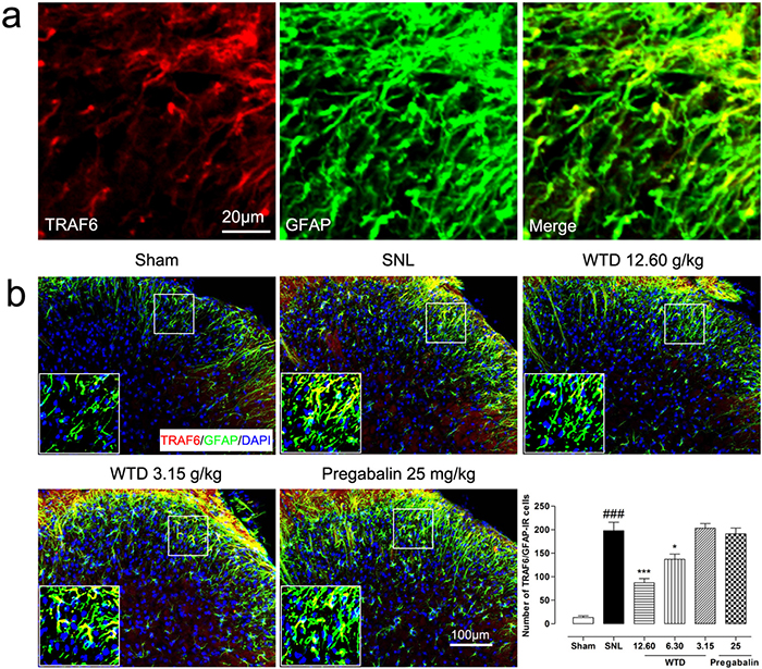 Figure 5: WTD decreased spinal astrocytic expression of TRAF6. 10 days after surgical operation, TRAF6 were primarily co-localized with astrocyte (a). Immunofluorescence staining showed WTD (3.15-12.60 g/kg), but not pregabalin (25 mg/kg, p.o.), dose-dependently decreased TRAF6/GFAP-IR cells in the superficial lamina of L5 spinal cord in SNL mice (b). Data are represented as mean ± SEM. ###P<0.001 vs. sham group, *P<0.05 and ***P<0.001 vs. SNL group.