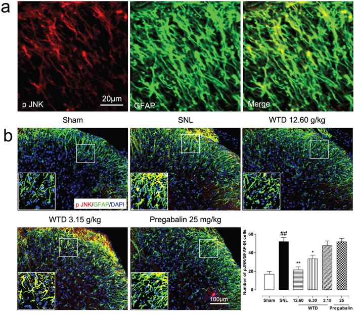 Figure 6: WTD decreased spinal astrocytic levels of p-JNK. 10 days after surgical operation, p-JNK were primarily localized in astrocyte (a). Immunofluorescence staining showed WTD (3.15-12.60 g/kg), but not pregabalin (25 mg/kg, p.o.), dose-dependently decreased p-JNK/GFAP-IR cells in the superficial lamina of SNL mice (b). Data are represented as mean ± SEM.##P<0.01 vs. sham group, *P<0.05 and **P<0.01 vs. SNL group.