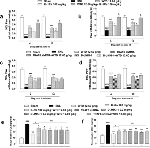 Additionally, co-treatment of IL-1Ra, but not LV-TRAF6 shRNA or D-JNKI-1, with WTD resulted in further inhibition of CCL2 and CXCL1 expressions in the L5 spinal cord of SNL mice (Figure 7e, 7f).