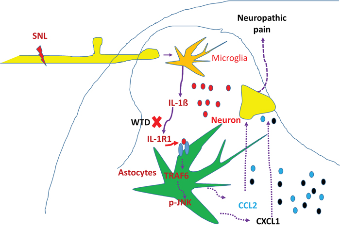 Figure 8: Schematic illustration of possible anti-hyperalgesia mechanisms of WTD under neuropathic pain conditions. Peripheral nerve injury induces pro-inflammatory cytokine such as IL-1β, causing the activation of spinal astrocytic IL-1R/TRAF6/JNK signaling and the subsequent releasing of chemokines such as CCL2 and CXCL1, which further facilitate synaptic transmission and enhance NP [19]. The effective inhibition IL-1β and its downstream signaling of IL-1R1/TRAF6/JNK, especially IL-1R1 in astrocytes may be involved in the anti-hyperalgesia effect of WTD under NP disorders.