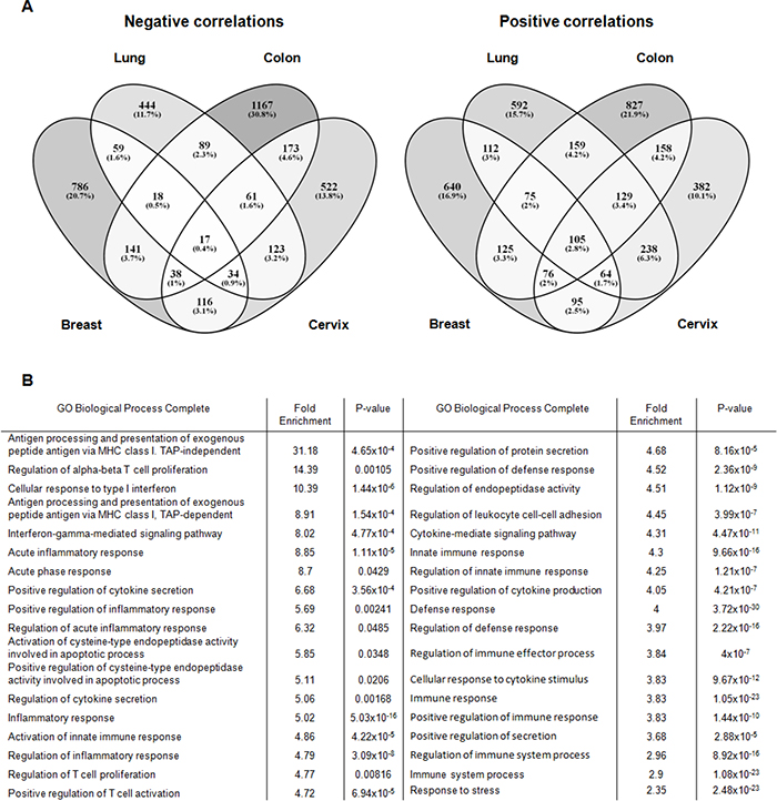 Figure 3: (A) Venn diagrams of the significant genes found negatively and positively correlated with MAP17 in lung, breast, colon and cervical tumors, showing that, for negative correlations, 17 genes appears equally negatively correlated and 105 genes positively correlated with MAP17 in the four tumor types considered (p-value < 0. 05). (B) GO Biological terms related to inflammation that appear with genes positively correlated with MAP17 in at least three of the four types of tumors.