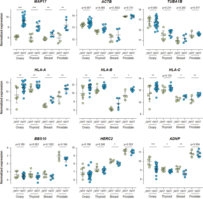 Figure 4: Expression of HLA-A, HLA-B, HLA-C, BBS10, HERC2 and ADNP in breast, thyroid and ovarian cancer samples, grouped by differential expression levels of MAP17, obtained through RNA normalization of public transcriptomic arrays, as described in Methods, Bioinformatic analysis section. Once grouped, Student’s T test for statistical analysis of the data was applied. * = p < 0.05; ** = p < 0.01; *** = p < 0.001. All significant differences found in ovary, thyroid and prostate tumors showed the same correlation with MAP17 that the previously found for breast, colon, cervix and lung tumors. In the case of non-significant differences, the tendency of the samples points, also, the same direction.