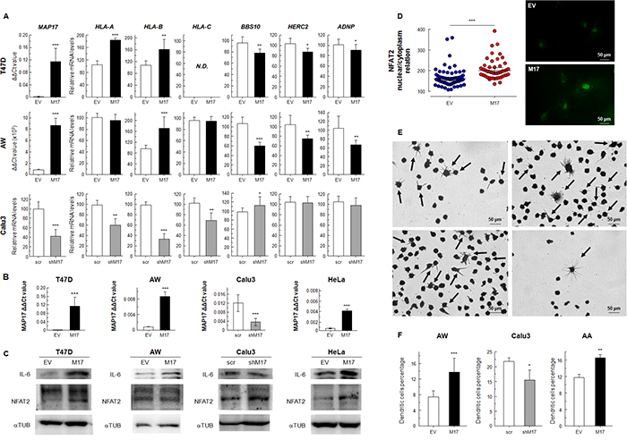 Figure 5: (A) mRNAexpression levels of HLA-A, HLA-B, HLA-C, BBS10, HERC2 and ADNP in cancer cells transfected for overexpression of MAP17 (T47D, AW) or knockdown of MAP17 with specific shRNA (Calu3). (B) MAP17 expression in human cells transfected to induce its overexpression (T47D, AW, HeLa) or knockdown (Calu3). (C) WB of NFAT2 and IL-6, pro-inflammatory proteins, in cancer cells that overexpress MAP17 (T47D, AW, HeLa) or with its expression downregulated (Calu3). IL-6 is clearly overexpressed in cell lines with higher MAP17 levels, while NFAT2 appears also with higher levels in the cells that overexpress MAP17. (D) NFAT2 nuclear proportion is increased due to MAP17 overexpression. Left) nuclear/cytoplasm relation in AW cells transfected with EV or MAP17 overexpressing vector, according to the fluorescence microscopy images obtained of NFAT2 expression. Right) Fluorescence microscopy of AW EV or AW MAP17 cells. The latter exhibits higher nuclear levels of NFAT2 (E) U937 cells attached to the plate, after being exposed to conditioned cell media (See Methods). Some cells showed the typical form of differentiated dendritic cells (black arrows). (F) Percentage of attached U937 cells for different conditioned media. The percentage of cells with dendritic morphology is higher for cells with higher MAP17 levels. All experiments were repeated a minimum of three independent times in triplicate. All figures include Student’s T test for statistical analysis of the data. * = p < 0.05; ** = p < 0.01; *** = p < 0.001.