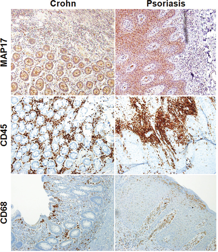 To finally confirm these data, we selected 20 samples of human Crohn’s disease and 20 samples of human psoriasis and tested the expression of MAP17 in these tissues. We found that 20 out of 20 psoriasis samples showed a clear presence of MAP17 in the epithelial parenchyma. These MAP17-positive cells appear surrounded by inflammatory cells (Figure 8). Similar data were obtained for samples from human Crohn’s disease; 75% of the samples analyzed showed clear staining for MAP17 in epithelial cells that were surrounded by inflammation (Figure 8). In all positive cases, we could observe a clear plasma membrane localization of MAP17. We also could observe a clear staining for CD45 and CD68 markers, two previously described specific surface markers of inflammation (Figure 8 and Supplementary Figures 8, 9 and 10). CD45, known also as common leukocyte antigen or receptor-type tyrosine-protein phosphatase C, is a very abundant leukocyte cell surface, being its expression restricted to haematopoietic cells [55]. CD68, a selective marker for monocytes and macrophages, have been previously connected to inflammatory diseases, like inflammatory bowel disease or Crohn’s disease [56, 57].