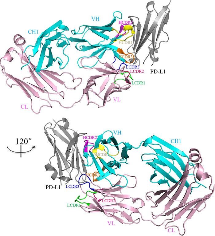 In conclusion, the crystal structure of therapeutic antibody atezolizumab complexed with PD-L1 solved here shows that the antibody blocks PD-1/PD-L1 pathway through competing with PD-1 for the binding surface on PD-L1 and this provides basis for further antibody optimization and for the development of novel chemical PD-L1 inhibitors for immunotherapy.