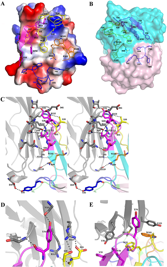 Figure 2: Detailed interactions in the interface of PD-L1/atezolimumab complex. The electrostatics surface of PD-L1 is shown in (A) with key residues from CDR loops of atezolizumab shown in sticks. The CDR loops are color with same scheme as in Figure 1 where HCDR1 is in yellow, HCDR2 in magenta, HCDR3 in orange and LCDR3 in blue. The binding surface of atezolizumab is shown in (B) with heavy chain in cyan and light chain in magenta. Some of the key residues of heavy and light chain are in sticks (B). The wall-eye stereo view of the interface of PD-L1/atezolizumab complex shows detailed hydrogen bonds between these two molecules (C). Residues involved are shown as sticks with hydrogen bonds as dashed lines.Y54 of HCDR2 is inserted into a cleft formed by CC’ loop and strand G of PD-L1 forming a hydrogen bond with V111 of PD-L1 which is further stabilized by the side chain of R125 of PD-L1 through cation-Pi interaction. The side chain of R125 is in turn stabilized by S30 and D31 from HCDR1 loop (A, D). PD-L1 residues of M115 along with Y56 and Y123 form hydrophobic interactions with a hydrophobic surface formed aromatic residues W33, W50, Y59 and W101 of CDR loops of atezolizumab (E).