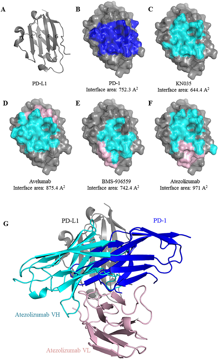 Figure 3: Comparison of the binding mode of anti-PD-L1 MAbs. The front β-sheet of PD-L1 is composed with strand C’, C, F and G (A). The binding surface area that is covered by PD-1 (B), KN035 (C), Avelumab (D), BMS-936559 (E) or Atezolizumab (F) is highlighted with the covered surface area calculated. The areas covered by heavy or light chain of MAbs (D, E, F) are color in cyan and pink respectively. Superposition of the structure of PD-L1/atezolizumab complex with PD-1/PD-L1complex (PDB: 4ZQK) shows clashes between PD-1 and atezolizumab indicating that the antibody competes with PD-1 for binding to PD-L1. the CH1domain of heavy chain and CL domain of light chain were omitted (G) for clarity.