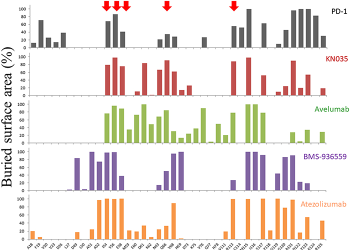 Figure 4: Buried surface areas of residues in PD-L1 binding interface. All the PD-L1 residues that are involved in binding to PD-1, KN035, Avelumab, BMS-936559 and Atezolizumab are selected with the percentage of the buried surface area of each residue plotted. The five hot-spot residues (I54, Y56, E58, Q66 and R113) identified from PD-L1/KN035 structure are labeled with red arrows. Although the structure of PD-L1/Durvalumab was also published recently, the coordinate of this structure has not been released and is not included here for comparison.