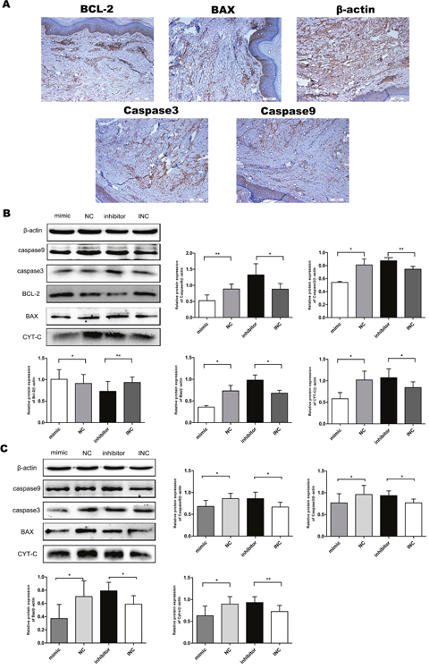 Figure 2: Expression profile of proteins related to mitochondria-mediated apoptosis in keloid fibroblasts. (A) Expression of apoptotic proteins in keloid tissue by IHC (n=3-6). Bar, 10μm. (B) Expression of pro-apoptotic proteins (caspase3, caspase9, CYT-C, BAX) was significantly increased in response to miR-21 inhibitor. In contrast, the expression of anti-apoptotic protein BCL-2 was decreased (n=3-6). (C) Inhibition of miR-21 tended to induce an overall shift of apoptotic proteins. To the contrary, mimic miR-21 inhibited apoptosis in normal fibroblasts (n=3-6); **p< 0.01; *p<0.05. Data are represented as mean ± SD.