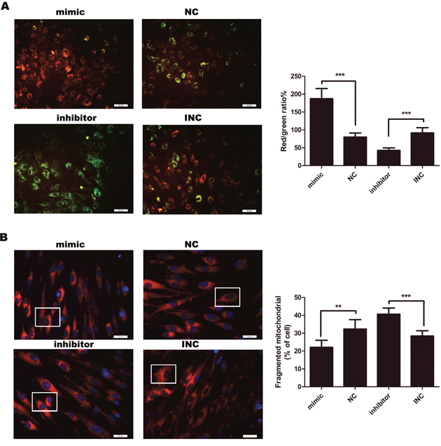 Figure 3: (A) Measurement of mitochondrial membrane potential (MMP) (n=4-6). After 12 hours, MMP was detected by JC-10 assay. MMP was decreased in response to inhibition of miR-21, compared with INC. To the contrary, mimic miR-21 inhibited apoptosis by attenuating the decline of MMP. Percentages of J-aggregates (red) and J-monomers (green) were shown in the histogram. Green J-monomers were accumulated in the mitochondria with a low potential; by contrast, red J-aggregates were accumulated in the mitochondria with a high potential. Bar, 25μm. (B) Mitochondria were stained by Mito Tracker® Deep Red FM (left panel). Bar, 25μm. Those cells with fragmented mitochondria were counted (right panel) (n=6); ***p<0.001; **p< 0.01. Data are represented as mean ± SD.