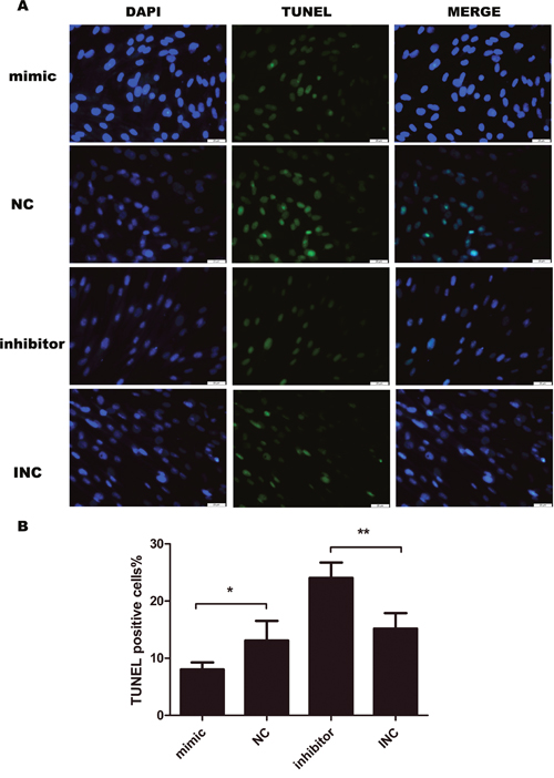 Figure 4: Cell apoptosis evaluated by TUNEL assay after transfection for 24 hours (n=4-5). Transient transfection of miR-21 inhibitor induces apoptosis in keloid fibroblasts, opposite to the effect of miR-21 mimic. Bar, 25μm; **p<0.01; *p<0.05. Data are represented as mean ± SD.