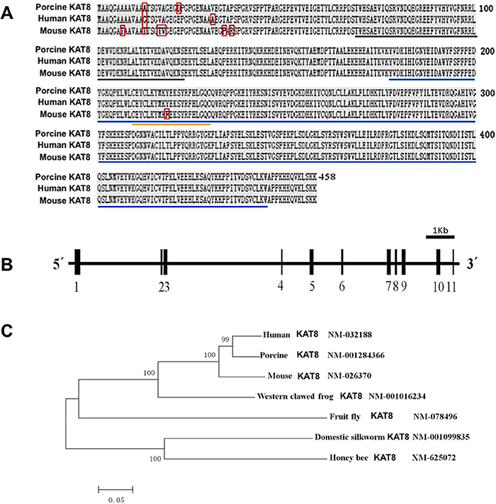 Figure 1: Genomic organization and homologous analysis of porcine KAT8. (A) The amino acid sequences of KAT8 from porcine, human and mouse were aligned by DNAMAN software. Identical amino acids are shaded in black. The sequences in red box are different between three species. The conserved domains are underlined in black, blue and yellow, respectively. (B) Schematic diagram of genomic structure of porcine KAT8. Solid boxes and horizontal lines represent the exons and introns, respectively. The transcript corresponding to pKAT8 consists of 11 exons separated by 10 introns. (C) Phylogenetic tree of KAT8 genes based on available KAT8 amino acid sequence from various organisms is drawn using MEGA 5.2 software.