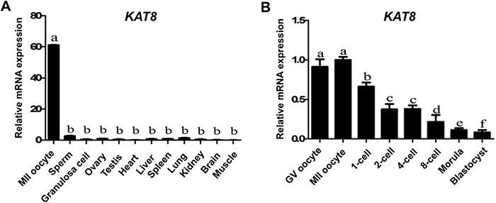 Figure 2: Relative abundance of KAT8 in porcine gametes, different tissues and early embryos. (A) KAT8 expression in oocytes, sperm, granulosa cells and different tissues. Relative levels of KAT8 mRNA were determined by qPCR from three independent replicates. Data were normalized against endogenous housekeeping gene EF1α1 and the value from ovary was set as one. Values are shown as mean ± S.E.M and different letters indicate significant differences (P < 0.05). (B) KAT8 expression in early embryos. Relative levels of KAT8 transcripts were determined by qPCR from three independent replicates. Data were normalized against endogenous housekeeping gene EF1α1 and the value from MII oocyte was set as one. Values are shown as mean ± S.E.M and different letters across stages indicate significant differences (P < 0.05).
