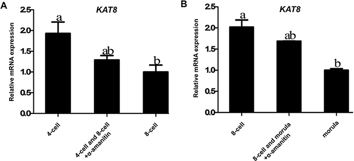 Figure 3: Confirmation of maternal origin of KAT8 expression. (A) KAT8 expression in control 4-cell, 8-cell and α-amanitin-treated 4-cell and 8-cell embryos. Relative levels of KAT8 mRNA were determined by qPCR from three independent replicates. Data were normalized against endogenous housekeeping gene EF1α1 and the value from control 8-cell embryos was set as one. Values are shown as mean ± S.E.M and different letters across groups indicate significant differences (P < 0.05). (B) KAT8 expression in control 8-cell, morula and α-amanitin-treated 8-cell and morula. Relative levels of KAT8 transcripts were determined by qPCR from three independent replicates. Data were normalized against endogenous housekeeping gene EF1α1 and the value from control morula was set as one. Values are shown as mean ± S.E.M and different letters indicate significant differences (P < 0.05).