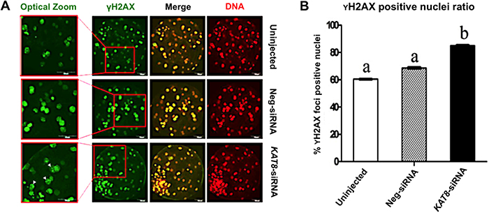 Figure 6: KAT8 knockdown induces DNA damage in porcine blastocysts. (A) Immunofluorescence staining of γH2AX. Blastocysts in uninjected, Neg-siRNA and KAT8 siRNA-injected groups were stained for γH2AX (green) and DNA (propidium iodide, red). The experiment was independently repeated three times. Representative fluorescence images are shown. Middle panel in each group shows the merged images (yellow) between γH2AX signal and DNA staining. Red solid insets indicate cells shown at higher magnification on the left. White arrowheads mark γH2AX foci positive cells. Scale bar: 50 μm. (B) Analysis of the ratio of γH2AX foci positive cells in blastocysts from three groups. The number of γH2AX foci positive and total cells of blastocysts (n=75, 63 and 53) was counted separately and the ratio of γH2AX foci positive:total cells was statistically analyzed. Data are shown as mean ± S.E.M and different letters across groups indicate significant differences (P < 0.05).