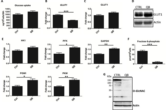 Figure 2: Quambalarine B (QB) treatment has a strong impact on glycolysis. (A) Changes in glucose levels in culture medium were determined using enzymatic assay. (B) Relative levels of GLUT1 mRNA in QB-treated cells compared to control (ctrl) were determined using RT-qPCR method. (C) Relative levels of GLUT1 protein in QB-treated cells compared to control (ctrl) quantified by LFQ analysis. (D) GLUT1 protein levels in QB-treated cells compared to control (ctrl) determined by immunoblot. (E) Relative levels of glycolytic enzymes, hexokinase (HK1), phosphofructokinase (PFK), glyceraldehyde 3-phosphate dehydrogenase (GAPDH), phosphoglycerate mutase (PGM1), and pyruvate kinase M (PKM) in QB-treated cells compared to control (ctrl) determined by LFQ analysis. (F) Fructose 6-phosphate levels in control (ctrl) and QB-treated cells (QB) determined by enzymatic assay. (G) Levels of O-GlcNAC modifications of individual proteins determined by immunoblot comparing treated (QB) and control (CTRL) cells. Data are shown as means from three independent experiments ± SEM. *, significant differences with P ≤ 0.05. **, significant differences with P ≤ 0.01. ***, significant differences with P ≤ 0.001. The images shown are representative of three independent experiments. In all experiments cells were treated with 2 μmol/L of QB.