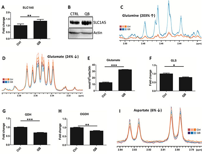 Figure 4: Quambalarine B (QB) deregulates glutamine metabolism in leukemic cells. (A) Relative levels of glutamine transporter SLC1A5 in control (ctrl) and QB-treated (QB) cells determined by LFQ analysis. (B) Levels of SLC1A5 transporter in control (CTRL) and QB-treated cells visualized by immunoblot. (C) Intracellular levels of glutamine in control (orange lines) and QB-treated (blue lines) cells determined by NMR analysis. (D) Intracellular levels of glutamate in control (orange lines) and QB-treated (blue lines) cells determined by NMR analysis. (E) Changes in glutamate levels in the culture medium after 24 h of control (ctrl) and QB-treated (QB) cells determined by HPLC analysis. (F, G, H) Relative levels of glutamine metabolism enzymes: glutaminase (GLS), glutamate dehydrogenase (GDH), and alpha-ketoglutarate dehydrogenase (OGDH) in control (ctrl) and QB-treated (QB) cells determined by LFQ analysis. (I) Intracellular levels of aspartate in control (orange lines) and QB-treated (blue lines) cells determined by NMR analysis. Data are shown as means from three independent experiments ± SEM. *, significant differences with P ≤ 0.05**, significant differences with P ≤ 0.01***, and significant differences with P ≤ 0.001. The images shown are representative of three independent experiments. In all experiments cells were treated with 2 μmol/L of QB.