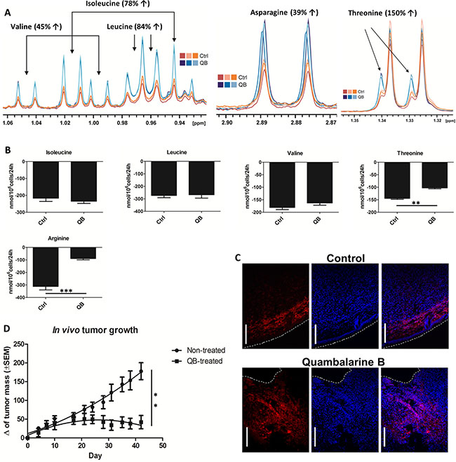 Figure 5: Quambalarine B (QB) increases levels of several AA in leukemic cells and inhibits tumor growth in vivo. (A) Intracellular levels of valine, leucine, isoleucine, asparagine and threonine in control (orange lines) and QB-treated (blue lines) cells determined by NMR analysis. (B) Changes in individual AA levels in the culture medium of control (ctrl) and QB-treated (QB) cells after 24 h incubation determined by HPLC analysis. (C) Distribution of macrophages (F4/80+) in solid tumors derived from human breast cancer cell line MDA-MB-231 developed and treated with QB in the immunocompromised mouse model (blue - cell nuclei visualized by DAPI, red – mouse macrophages (F4/80+), dashed white line – tumor edge, white bar corresponds to 100 μm). (D) Effect of QB on tumor growth in vivo. Results from in vivo experiment represent mean ± SEM of value from one experiment (5 mice per group). All data are shown as means from three independent experiments ± SEM. *, significant differences with P ≤ 0.05. **, significant differences with P ≤ 0.01. ***, and significant differences with P ≤ 0.001.