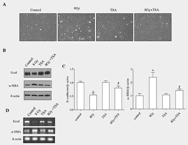 Figure 1: TSA inhibits EMT induced by irradiation in RLE-6TN cells. (A) RLE-6TN cells were grown to 60% confluency in tissue culture plates and treated with TSA (100nM) for 2 h followed by radiation treatment at the dose of 8Gy. Images were captured at the magnification of 200X using inverted microscope and representative morphological changes are shown. (B) The protein levels of E-cadherin and α-SMA were determined using western blot analysis at 72 h post-treatment with radiation and/or. (C) Densitometric analysis of the Western blot results from B. Data are mean ± SEM; n = 3; * p < 0.05 vs. non-irradiated control; # p < 0.05 vs. irradiated control. The same amounts of total protein are loaded in each lane. (D) RT-PCR analysis of E-cadherin mRNA and α-SMA in the cells collected at 72h postirradiation.