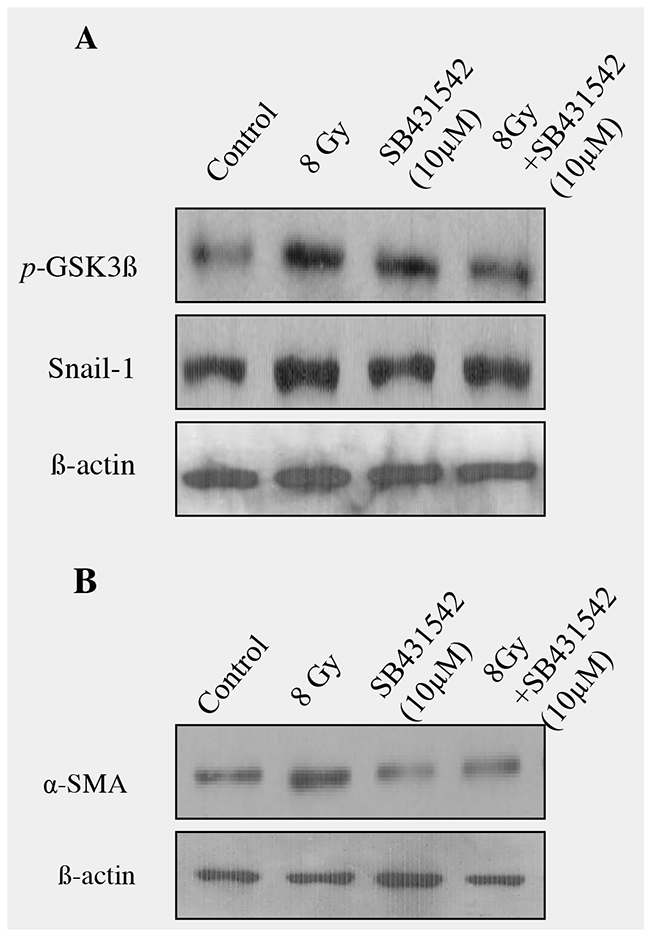 To know if TGFβ1 plays a crucial role in radiation-induced alveolar EMT, TGF inhibitor SB431542 (10μM) was incubated for 2 hours in RLE6TN cells and exposed to radiation (8Gy) and EMT related proteins were analyzed. Western blot analysis on pGSK-3β (Ser9), Snail and α-SMA proteins showed that addition of the TGF-β1 receptor inhibitor, SB431542 significantly blocked the radiation-induced GSK-3β phosphorylation at serine 9; whereas there was a partial decrease in the Snail protein in irradiated rat alveolar epithelial cells (Figure 6A). Moreover, inhibition of TGF-β by SB-431542 also reduced the radiation-induced increase of α-SMA (Figure 6B). Our results demonstrate that inhibition of TGFβ1 effectively prevented the transition of epithelial cell to mesenchymal cells and it showed that TGF signalling, at least in part, is necessary for radiation-induced EMT.