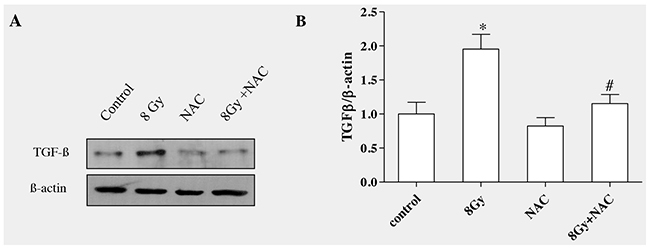 Figure 7: ROS scavenging decreased radiation-induced TGF-β1 level in RLE-6TN cells. RLE-6TN cells were incubated with/without NAC (5mM) for 4h prior to irradiation with 8 Gy. The protein level of TGF-β1 was determined in the cell lysate at 7h postirradiation. (A) Shows representative blot of TGF-β1. Decreasing ROS production reduced the protein level of TGF-β1 in irradiated RLE-6TN cells. (B) Shows the densitometric quantification of three independent samples. The results are mean ± SEM; n = 3; * p < 0.05 vs. non-irradiated control; # p < 0.05 vs. irradiated group.