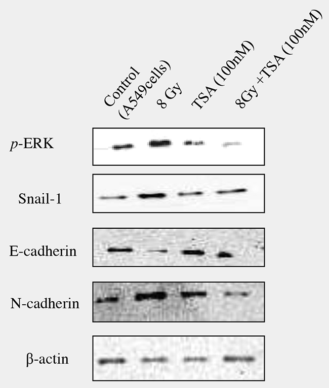 Figure 8: Effect of TSA on irradiated A549 cells. In order to confirm the inhibitory effect of TSA on radiation-induced EMT, the effect was tested using A549 cells, a model to study the EMT. TSA (100nM) was incubated 2 hours prior to radiation and western blot analysis on pERK, Snail-1, E-cadherin, N-cadherin was performed and representative blots were shown in the Figure 8.