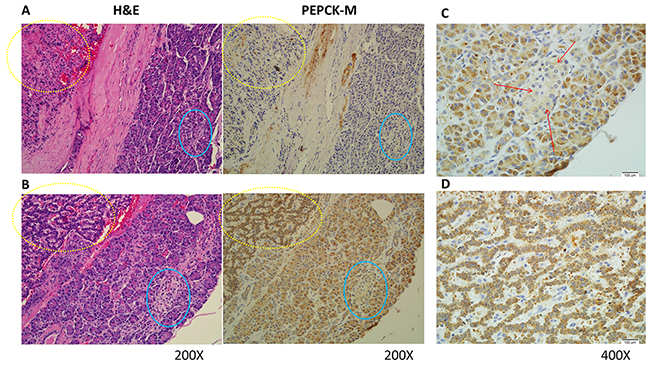 Figure 1: Representative hematoxylin and eosin (H&E) staining and immunohistochemical staining patterns for PEPCK-M in pNET tumor cells are shown (200X). (A) H&E and PEPCK-M staining for patient No. 2. PEPCK-M expression was weak (1+) in both tumor and non-neoplastic islet cells. (B) H&E and PEPCK-M staining for patient No. 20. PEPCK-M expression was strong (3+) in the tumor cells but weak (1+) in the non-neoplastic islet cells. The tumor cells are marked within yellow dashed circles, and the islet cells are marked within blue circles. (C) Magnified images (400X) of the islet cells marked by red arrows in Figure 1B. (D) Magnified images (400X) of the tumor cells in Figure 1B.