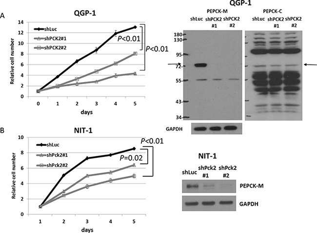 Figure 2: Cell proliferation curves of QGP-1 and NIT-1 cells with shRNA against PCK2 and Pck2 and vector control Luc from day 1 to day 5. (A) (Left) QGP-1 cells with knockdown of PCK2 (2 clones, shPCK2#1 and shPCK2#2) had significantly lower rates of proliferation than QGP-1 cells infected with vector control (shLuc). (Right) The protein expression of PEPCK-M and PEPCK-C in QGP-1 cells with and without PCK2 knocked down. (B) NIT-1 cells with knockdown of Pck2 (2 clones, shPck2#1 and shPck2#2) had significantly lower rates of proliferation than NIT-1 cells infected with vector control (shLuc).