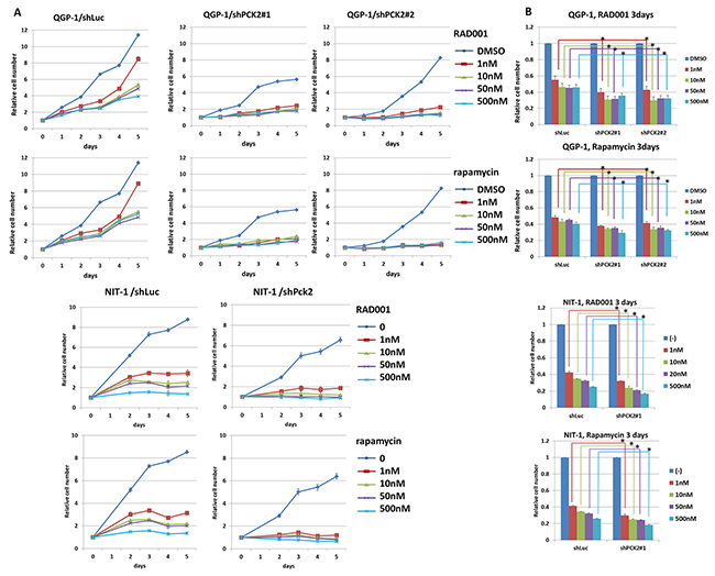 Figure 3: Cell proliferative curves and survival rate of QGP-1 and NIT-1 cells with or without knockdown of PCK2 or Pck2 and treatment of mTOR inhibitors, rapamycin or RAD001. (A) The cell proliferative rate was reduced by RAD001 and rapamycin for both QGP-1 and NIT-1 cells infected with vector control (shLuc). The cell proliferative rate of QGP-1 and NIT-1 cells was further decreased by RAD001 or rapamycin when PCK2 was knocked down (shPCK2 and shPck2). (B) The survival rate of QGP-1 and NIT-1 cells treated with RAD001 or rapamycin for 3 days is shown. The survival of QGP-1/shPCK2 was significantly poorer than that of QGP-1/shLuc in low and higher dose of RAD001 or rapamycin. The similar result was also seen in NIT-1 cells. T test, * P<0.05.