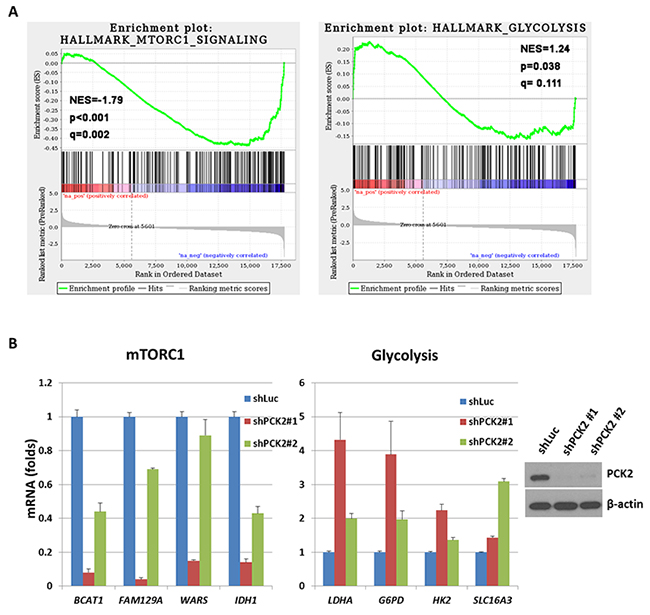 Figure 4: The result of gene expression microarray for QGP-1 cells with knockdown of PCK2 compared with QGP-1 infected with vector control (shLuc). (A) Two representative significantly enriched gene sets in the differential expression profiles. Hallmark_mTORC1_sugnaling is negatively enriched (down-regulated) and Hallmark_Glycolysis is positively enriched (up-regulated) in general in QGP-1 cells with PCK2 knocked down. (B) the ratio of quantitative RT-PCR for 4 down-regulated genes, BCAT1, FAM129A, WARS, and IDH1 in mTORC1-related gene sets and 4 up-regulated genes, LDHA, G6PD, HK2, and SLC16A3, in Glycolysis-related gene sets in QGP-1 cells with knockdown of PCK2 (shPCK2) relative to that in QGP-1 cells without knockdown of PCK2 (shLuc).