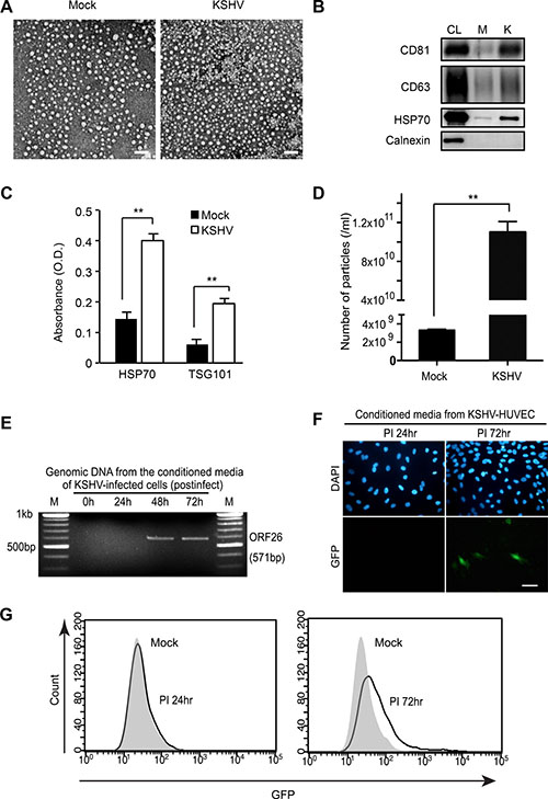 Figure 1: Isolation of extracellular vesicles (EVs) from KSHV-infected primary human endothelial cells. (A) Electron microscopic images of EVs isolated from supernatants of mock- or KSHV-infected human umbilical vein endothelial cells (HUVECs) at 24 hpi. Scale bar: 100 nm. (B) Western blotting for EVs markers in EVs from mock- (M) or KSHV-infected HUVECs (K). CL: cell lysate. (C) Detection of HSP70 in EVs isolated from supernatants of mock- or KSHV-infected HUVECs by Enzyme linked immunosorbent assay (ELISA). Results are shown as mean ± SD, N=3, **p < 0.01. (D) Microparticle number analysis of EV preparation from mock- and KSHV-infected HUVECs at 24 hpi. Microparticle number was analyzed by nanoparticle tracking analyzer, ZetaView. Results are shown as mean ± SD, N = 5, **p < 0.01. (E) Detection of KSHV virion DNA by PCR. To detect KSHV DNA, virions were isolated from the supernatants of KSHV-infected HUVECs at 0, 24, 48, and 72 hpi by ultracentrifugation. The pellet was treated with RNase-free DNase I, followed by genomic DNA extraction. Then, KSHV ORF26 region was amplified by PCR. (F–G) Infectious KSHV is absent in supernatants of KSHV-infected HUVECs at 24 hpi. Supernatants were collected at 24 hpi and 72 hpi, concentrated 30X, and used to infect naïve HUVECs. After infection, green fluorescence protein (GFP) expression was analyzed by fluorescence microscopy or flow cytometry to monitor infection. Nuclei were stained with 4′,6-diamidino-2-phenylindole (DAPI). Scale bar: 50 μm.