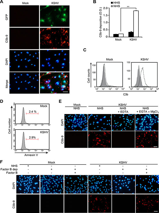 Our result from proteomics analysis of EVs indicated an alteration of the complement system. To investigate whether de novo KSHV infection would cause complement activation, we examined the deposition of membrane attack complex (MAC) or C5b-9 on mock- and KSHV-infected HUVECs at 24 hpi following incubation of the cells with normal human serum (NHS). The deposition of MAC was observed on KSHV- but not mock-infected cells (Figure 3A). To quantify the deposition of C5b-9 on cells, a cell-based enzyme linked immunosorbent assay (ELISA) technique was applied [20]. There were about 9-fold higher C5b-9 depositions on KSHV- than mock-infected cells treated with NHS (Figure 3B). Heat-inactivated human serum (HHS) was used as a negative control and C5b-9 deposition was not observed on HHS-treated KSHV- and mock-infected cells. Since C3b is known to bind covalently to cell surfaces after complement activation [21], we examined the presence of C3b on cell surfaces by flow cytometry. Only KSHV- but not mock-infected HUVECs showed a significant increase in cell surface-bound C3b (Figure 3C). Several previous studies have indicated that apoptosis is an initiating factor of complement activation [22, 23]. Hence, we examined apoptosis at 24 hpi by flow cytometry (Figure 3D). Both mock- and KSHV-infected HUVECs had very few apoptotic cells (< 3%), suggesting that complement activation observed during de novo KSHV infection was not due to apoptosis.