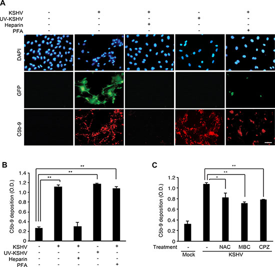 Figure 4: Complement activation depends on the entry and trafficking stages of KSHV infection. (A–B) Effects of inhibiting early phases of KSHV infection on complement activation. HUVECs were treated with soluble heparin or phosphonoformic acid (PFA) before and during KSHV infection, or infected with UV-irradiated KSHV, and examined for surface deposition of C5b-9 by IFA (A) and a cell-based ELISA (B). Nuclei were stained with DAPI. Heparin: treatment with 10 μg/mL of soluble heparin, PFA: treatment with 300 μg/mL of phosphonoformic acid. Scale bar: 50 μm. OD: optical density. Results are shown as mean ± SD, N = 3, **p < 0.01. (C) Effects of inhibitors preventing the entry of KSHV on complement activation. HUVECs were treated with a scavenger of reactive oxygen species N-acetyl-cysteine (NAC), an inhibitor of lipid raft formation methyl-β-cyclodextrin (MBC), or an inhibitor of clathrin-mediated endocytosis chlorpromazine (CPZ) for 1 h, infected with KSHV in the presence of the respective inhibitors for 24 h, and examined for C5b-9 depositions by a cell-based ELISA. Mock: mock-infected HUVECs, KSHV: KSHV-infected HUVECs, Results are shown as mean ± SD, N = 3, *p < 0.05, **p < 0.01.