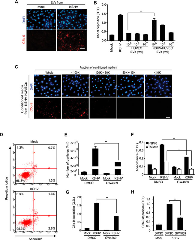 Figure 5: EVs from KSHV-infected human endothelial cells activate the complement system. (A) EVs from KSHV-infected HUVECs activate the complement system. HUVECs treated with EVs from mock- or KSHV-infected HUVECs were examined for C5b-9 depositions. EVs isolated from the supernatant of mock- or KSHV-infected cells at 24 hpi were used to treat naive HUVECs for 24 h. After exposure to the EVs, all cells were treated with normal human serum (NHS) for another 30 min, and C5b-9 was analyzed by IFA. Scale bar: 50 μm. (B) Quantification of C5b-9 depositions on HUVECs treated with a same number of EVs from mock- or KSHV-infected HUVECs using a cell-based ELISA. Mock: mock-infected HUVECs, KSHV: KSHV-infected HUVECs. Results are shown as mean ± SD, N = 3, **p < 0.01. (C) The high molecular weight fraction of supernatant from KSHV-infected cells induces complement activation. The supernatants were fractionated using Vivaspin 20 protein concentrator spin columns with molecular weight cut-offs of 100, 50, and 10 kDa. Each isolated fraction was used to treat uninfected HUVECs for 24 h, followed by treatment with NHS. C5b-9 depositions were analyzed by IFA. Scale bar: 50 μm. (D) EVs do not induce apoptosis and cell death. HUVECs treated with the EVs from mock- or KSHV-infected human endothelial cells were examined for apoptosis and dead cells by flow cytometry analysis following staining for Annexin V- and propidium iodide (PI)-positive cells. (E–H) Inhibition of EV biogenesis during de novo KSHV infection suppressed complement activation. HUVECs pretreated with dimethyl sulfoxide (DMSO) or 10 μM GW4869 for 1 h were either mock-infected (M) or infected with KSHV (K) in the presence of the respective agents. The supernatant (CM) was collected at 24 hpi and the inhibitory effect of GW4869 on the production of EVs was analyzed by counting microparticles number and examining the levels of HSP70 in the CM using nanoparticle tracking analyzer (E) and ELISA (F), respectively. Each CM was applied to naïve HUVECs for 24 h, followed by treating with NHS for 30 min. C5b-9 depositions were analyzed by cell-based ELISA (G) and IFA (Supplementary Figure 3A) (H) Suppression of complement activation in de novo KSHV-infected HUVECs by GW4869. HUVECs pretreated with GW4869 were infected by KSHV followed by exposing the cells with NHS. The depositions of C5b-9 were quantified by cell-based ELISA. Results are shown as mean ± SD, N = 3, **p < 0.01.