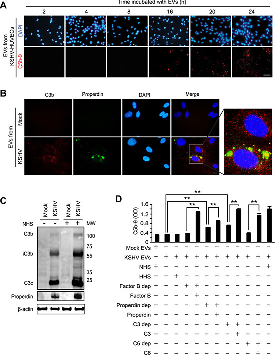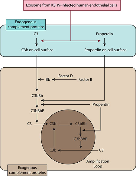 In this study, we have described a novel role of EVs from de novo KSHV-infected human endothelial cells in complement activation. The complement activation by KSHV-induced EVs is mediated by the alternative complement pathway, which is associated with the activation of endogenous C3 and properdin.