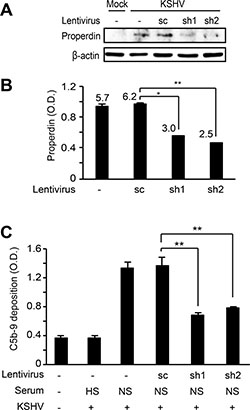 Figure 7: Knockdown of properdin in HUVECs suppresses complement activation by KSHV infection. HUVECs transduced with lentiviruses containing properdin-specific shRNAs (sh1 and 2) and selected with puromycin for 10 days were infected with KSHV for 24 h. Properdin expression was examined by western blotting (A) and the secreted properdin in supernatants was quantified using a human properdin ELISA kit (B). Numbers represented on the graph indicate concentrations of properdin (ng/mL) after calibration with purified recombinant properdin. (C) Complement activation was examined by quantifying C5b-9 deposition using a cell-based ELISA. sc: scrambled shRNA, HS: heat-inactivated human serum, NS: normal human serum. Results are shown as mean ± SD, N = 3, *p < 0.05, **p < 0.01.