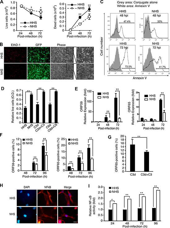 Complement activation can lead to cell lysis, which is effectuated by MAC. However, sublytic complement activation is frequently associated with enhanced cell survival [38, 39]. We investigated the effect of complement activation on cell survival during KSHV acute infection. Compared to HHS-treated cells, NHS-treated cells showed significantly higher numbers of live cells and lower numbers of dead cells at 48 and 72 hpi (Figure 9A). We observed a greater number of EthD-1-positive dead cells and floating cells in HHS- than NHS-treated cultures (Figure 9B). Because dead cells lose their GFP signals, fewer GFP expressing cells were observed among HHS-treated cells than NHS-treated cells. There were also more Annexin V-positive apoptotic cells in HHS- than NHS-treated cultures (Figure 9C). Together, these results indicated that complement activation conferred a survival benefit to KSHV-infected endothelial cells during acute infection.