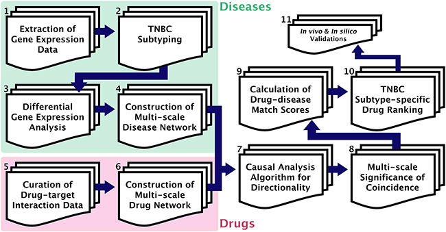 Figure 1: GenEx-TNBC workflow. (1) Gene expression data obtained for cell line (Neve et al [19]) and patient-based (TCGA [20]) TNBC samples. (2) Molecular subtyping of TNBC samples performed for cell line (Lehmann et al [4]) and patient-based (TNBCtype [21]) data. (3) Significantly differentially up-regulated and down-regulated genes found for a given subtype, compared to samples of all other subtypes. (4) Multi-scale disease perturbation signature created by overrepresentation analysis of up- and down-regulated gene sets, separately, for associated functions (DAVID [22]) and pathways (ConsensuspathDB [23]). (5) Drug-protein target binding interaction data curated for FDA-approved and experimental drugs from DGIdb [24] and CTD [25]. (6) Multi-scale drug action signature created by annotation of pathways and functions associated with drug targets. (7) Directionality algorithm implemented to match drug action network to disease perturbation network based on opposite directional effect on biological entities, and irrespective of directionality at the level of targeted PPIs (STRING [26]) of disease-modulated gene products. (8) Hypergeometric test used to calculate statistical significance of resulting coincidence between drug and disease networks, separately at each scale of biological action. (9) Significance values normalized, log-transformed, and summated with weights for each level of biological action to produce drug-TNBC subtype association. (10) Drugs ranked against a given TNBC subtype based on descending drug-disease association score. (11) GenEx-TNBC findings validated based on literature findings and cell viability testing for drugs of interest against a subtyped cell line model.